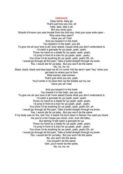Grenade - Bruno Mars LyricsBruno Mars - Grenade Lyric Video Support me by subscribing and dont forget to hit that like buttonBrunoMars Grenade lyr. About Press Copyright Contact us Press Copyright Contact us. Bruno Mars - Grenade Lyrics.